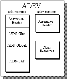 Das ISDNLAP erscheint auf dem Desktop als System-Datei vom Typ ADEV. Dieses ADEV enthält in seiner Resource Fork die Teile des ISDNLAP als einzelne Resourcen (Abb. B.2.1).
