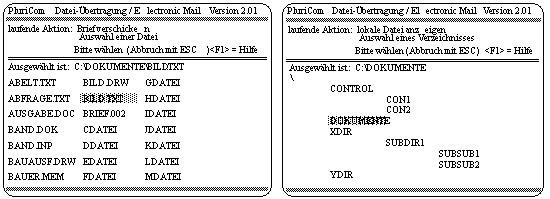 Das Kermit-Filetransfer-Protokoll erlaubt die Kommunikation zwischen einer Vielzahl von Rechnern mit unterschiedlichen Betriebssystemen. Kompatible Erweiterungen des Protokolls unterstützen eine komfortable und einfache Benutzerschnittstelle. Zentrale Eigenschaften dieses Bedienungskomforts sind die kontextabhängige Help-Funktion, die Auswahl aus den grafisch aufgearbeiteten Verzeichnissen sowohl der lokalen Maschine als auch des Servers und die Unterstützung beim Zurechtfinden in den Verzeichnisbäumen (siehe Abb. 5.1.1).