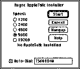 Async AppleTalk wird installiert, indem man das Installations-Deskaccessory im Apfelmenü startet. Es erscheint eine Dialogbox mit verschiedenen Auswahlmöglichkeiten und einer Statuszeile. Die Geschwindigkeit ist zwischen 1200 und 19200 Baud wählbar. Der Start-Knopf installiert den Treiber im System und wählt gegebenenfalls über Modem. Der Cancel-Knopf beendet das Deskaccessory ohne Auswirkungen auf die Verbindung. In ein editierbares Textfeld kann eine Rufnummer eingeben werden, welche bei der Installation des Treibers auf Wunsch automatisch angewählt wird. Ist eine Verbindung hergestellt, so wird der Erfolg in einer Statuszeile gemeldet (siehe Abb. 5.2.1). Das Deskaccessory sichert die Konfiguration einer erfolgreichen Verbindung, so daß die Parametereinstellung nicht jedesmal neu vorgenommen werden muß.