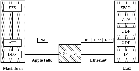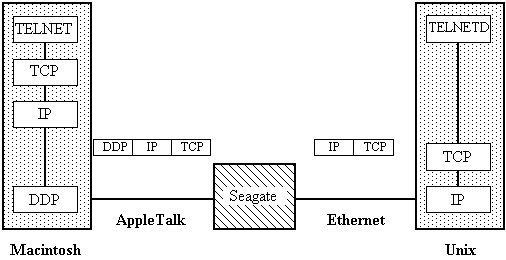 Alle bisher bekannten Gateways für Ethernet, auch FastPath, basieren im wesentlichen auf einer Public Domain-Software der Stanford University[27]. Seagate (Stanford Ethernet AppleTalk Gateway) ist eine Brücke, die ein Ethernet mit einem AppleTalk-LAN verbindet und sowohl die AppleTalk Internet-Protokolle als auch das ARPA[28] Internet Protocol unterstützt.
