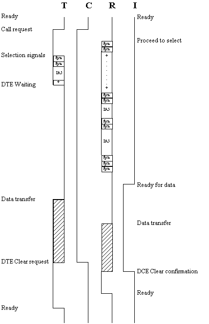 Innerhalb von 3 Sekunden antwortet die DCE mit der Wahlaufforderung. Diese besteht aus zwei einleitenden SYN-Zeichen ($16) gefolgt von einer unbestimmt langen Sequenz von „+“-Zeichen. Nach spätestens 6 Sekunden muß die DTE mit dem Senden der Wahlzeichen beginnen, und nach 36 Sekunden muß dieser Vorgang abgeschlossen sein. Eine Wahlsequenz besteht aus zwei einleitenden SYN-Zeichen, gefolgt von Zeichen des Internationalen Alphabetes Nr. 5 (IA5) und abgeschlossen durch einen „+“-Character. Danach sendet die DTE auf der Transmit-Leitung kontinuierlich binäre „1“.