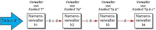 Ein bekanntes Verfahren zur globalen Auflösung hierarchischer Namen nach dem oben dargestellten Prinzip ist die sog. Remote Pathname Expansion [Sheltzer, 86[AL3]]. Hierbei wird bei Anfragen nach absoluten Namen (z.B. „/a.b.c.d“ in Abbildung 4.2) ausgehend vom Namensverwalter des Wurzelkontexts die Auflösung sukzessive an den Namensverwalter geleitet, der den gesuchten Namenseintrag enthält. Jeder Namensverwalter, an den eine Anfrage gerichtet ist, versucht mit Hilfe seiner lokalen Namensbasis einen weiteren Teil des Namens aufzulösen und Navigationsinformation hierfür zu ermitteln. Existiert zu einem partiellen Namen ein Verweis auf einen weiteren Namensverwalter, so wird der verbleibende Namensteil zur Auflösung an den ermittelten Namensverwalter übergeben (vgl. Abbildung 4.2). Dieser Vorgang der Auflösung wiederholt sich, bis der Namenseintrag des gesuchten Namens in einem Namensverwalter im Verwalternetz lokalisiert wurde. Schließlich wird der Name lokal vollständig aufgelöst, und der an den Namen gebundene Objekt-Bezeichner zurückgegeben.