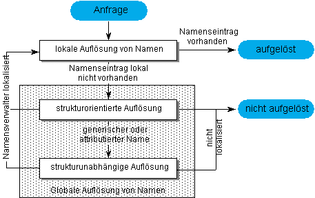 Strukturunabhängige Verfahren zur globalen Auflösung von Namen trennen den Vorgang der Lokalisierung des zuständigen Namensverwalters und die eigentliche Auflösung des Namens zum Objekt-Bezeichner. Im ersten Schritt wird unabhängig von der Struktur des aufzulösenden Namens der für die Verwaltung des zugehörigen Namenseintrags zuständige Namensverwalter im Verwalternetz lokalisiert. Anschließend findet dort lokal die Auflösung des Namens zum Objekt-Bezeichner statt.