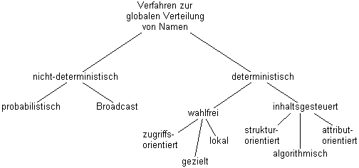 Die bisher beschriebenen Methoden zur nicht-deterministischen Verteilung von Namensinformation plazieren Namenseinträge im Verwalternetz, ohne den Inhalt der Namen und die Struktur des Namensraums zu berücksichtigen. Deterministischen Verfahren zur Plazierung von Namen können hingegen unterteilt werden in wahlfreie Verfahren, die Namenseinträge unabhängig von ihrem Inhalt plazieren, und inhaltsgesteuerte Verfahren, die den Inhalt der Namenseinträge bei der Plazierung im Verwalternetz berücksichtigen: