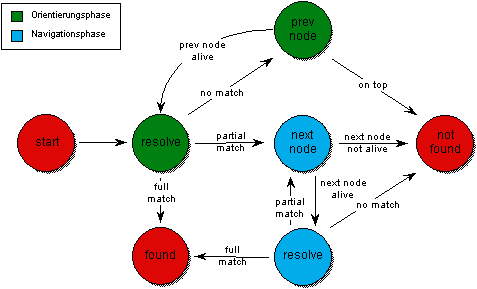 Der folgende Abschnitt stellt strukturorientierte Auflösungsverfahren vor, die basierend auf der Interpretation des gesuchten Namens und der Navigationsinformation in Namensverwaltern Anfragen gezielt an den zuständigen Namensverwalter im Verwalternetz leiten. Die Navigationsinformation in Namensverwaltern gibt an, über welche Verbindung eine Partition des globalen Namensraums erreicht wird. Durch die Interpretation des Namens während der Auflösung und mit Hilfe von Navigationsinformation kann die Erkundung des Verwalternetzes gezielt gesteuert werden. Dieses Vorgehen, das auch als Navigation im Verwalternetz verstanden wird und hier nur im Ansatz formuliert ist, soll in den nächsten Abschnitten weiter präzisiert werden.