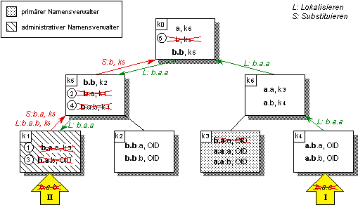 Ein Vorteil der in Abbildung 4.11 vorgestellten Art der Propagierung von Namenseinträgen ist, daß nicht jeder Namensverwalter alle Informationen halten muß. Bei der Auflösung von Namen wird spätestens in der Wurzel der Verwalterhierarchie der gesuchte Namenseintrag oder Navigationsinformation auf den primären Namenseintrag lokalisiert, sofern sich untergeordnete Namensverwalter zur Namensauflösung schrittweise jeweils an den übergeordneten Namensverwalter wenden.