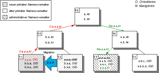 In der dynamischen globalen Namensverwaltung ist die Migration benannter Objekte und der zugehörigen Namenseinträge durch Löschen und Registrieren realisiert. Migriert ein Objekt, so werden die Namenseinträge zunächst im primären und im administrativen Namensverwalter gelöscht und anschließend im Zielknoten erneut global registriert. Übergeordnete Kontexte und deren Namensverwalter sind von der Migration nur dann betroffen, wenn der Name des migrierenden Objekts der einzige im Kontext ist. Der Namenseintrag des migrierenden Objekts wandert syntaxgesteuert mit einem Verweis auf den neuen primären Namensverwalter zu seinem ursprünglichen administrativen Namensverwalter und kann bei Anfragen dort wie gewohnt lokalisiert werden (vgl. Abbildung 5.11).
