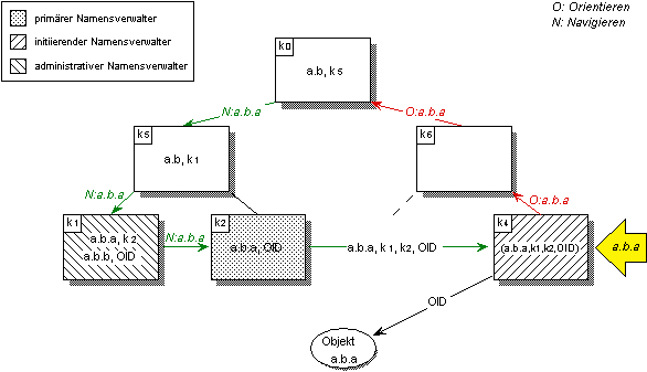 Die dynamische globale Namensverwaltung verwendet ein Verfahren zum Vorhalten von Namenseinträgen, wobei vorgehaltene Namenseinträge den Objekt-Bezeichner des an den Namen gebundenen Objekts, sowie einen Verweis auf den primären und auf den administrativen Namensverwalter enthalten (vgl. Abbildung 5.12).